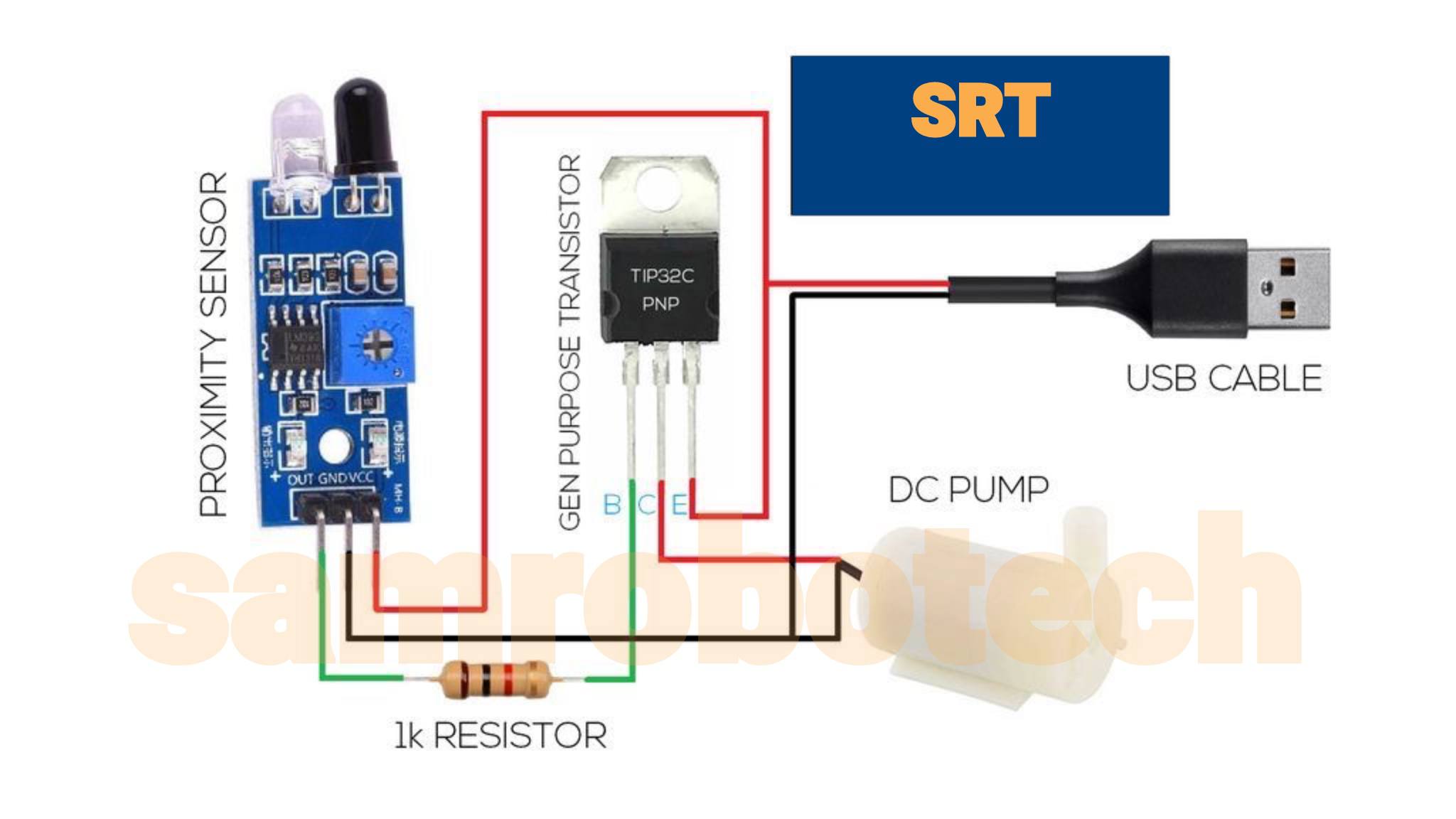 پمپ آب مستقیماً از ترانزیستور فرمان میگیرد و با USB روشن و خاموش میشود و نحوه اتصال پمپ به آب به این صورت است که پایه کلکتور ترانزیستور به یک سر پمپ آب و پایه دیگر پمپ آب به زمین متصل میشود .