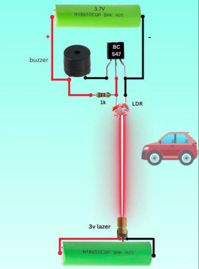 در مدار ما، لیزر دائماً روی سطح LDR تابیده میشود. تا زمانی که نور لیزر وجود دارد، LDR مقاومت کمی دارد و ولتاژ کمی به پایه بیس ترانزیستور منتقل میشود.
